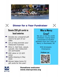 We are currently accepting donations of restaurant gift cards valued at $50 for our 2026 Dinner for a Year fundraiser. Gift card donations from local restaurants can be mailed to PO Box 10582, Rochester NY 14610. To arrange pick-up contact president@mercycrew.org. All donations should be received by March 1, 2026.